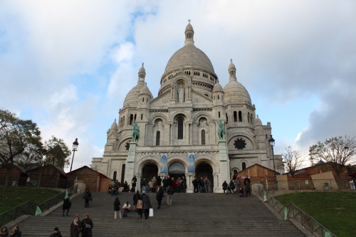 3분먼저 사크레퀘르라는 이름부터 알아보겠습니다. 각각 성스러운 심장이라는 뜻의 프랑스어로 한글로 하면 성심성당이 됩니다. 여기서 심장은 예수의 성스러운 심장을 뜻하구요. 보통 성심성당들의 경우 성모마리아의 심장을 뜻하는 경우가 많고 특히 사크래케리가 지어졌을 무렵에 성당들은 많은 경우 성모마리아 이름을 붙이거나 성모마리아에게 봉헌되는 경우가 많았는데요. 그런 점에서 조금 더 특별한 의미를 뛴다고 할 수 있습니다. 인류에 대한 성스러운 예수의 사랑을 뜻하는 의미에서 그의 성스러운 심장이라는 이름을 붙였어요. 로마 가톨릭 순례교성당 사크레퀘르의 공식 명칭은 바실리크 뒤 사카야 입니다. 여느 유럽 성당들처럼 카테드랄이 아니라 바실리크인 이유는 카테드랄이라는 명칭은 교구성당에게 주어지고 바실리카는 교황의 특권으로 몇몇 성당에게 특정하여 주어지는 이름이기 때문인데요. 카테드라라는 단어의 바실리카는 고대 그리스 시대에 왕을 대신해서 판결을 내리던 재판소를 칭하던 명칭으로 폼페이 유적지에 가보면 바실리카 흔적이 남아있기도 할 정도로 기원전부터 사용되던 단어입니다. 로마의 성 베드로바실리카도 있고 아시시의 성 프란체스코 바실리카도 있구요. 이렇게 성인들의 무덤 위에 지은 여러 예배당들이 바실리카라는 이름을 갖는 경우가 꽤 있는데요. 교회법에 따라서 메이저와 마이너바실리카로 나뉘기도 하는데 세계적으로 딱 4개의 바실리카만이 메이저 바실리카로 구분이 되고 모두 로마에 있습니다. 이 메이저 바실리카들은 다른 어떤 예배당보다도 우위를 점하는 상급예배당으로 취급을 받구요. 카테드랄들은 상당수가 중세시대에 지어졌는데요. 이 대성당들을 이끌던 주교가 있고 이 주교가 특정 교구를 이끌었던 경우 카테드랄이라는 이름을 받았습니다. 바실리카인 사크레케르는 따라서 교구성당이 아니라 예수의 성심에 경배하는 순례지이자 독립된 성소로써 성당 같은 것을 성스럽게 명명하는 것을 축성이라고 하는데 사크레케르는 1876년 건축을 시작해서 1910년 완공되었고 1919년 축성되었습니다. 파리에서 가장 높은 지리적 위치인 높이 130미터의 몽마르트 언덕 뷰츠크 목마르트의 꼭대기에 자리하는 사크레퀘르는 에펠탑 다음으로, 파리 시내에서 두 번째로, 높은 곳입니다. 성당 자체가 높기보다는 언덕이 높아서 여기까지 합해서 고도가 두 번째로, 높은 경우인데요. 돔과 종탑의 높이는 91미터로 사크레케르는 해발고도 213미터에 위치합니다. 제가 첫 투어 라이브 가이드로 소개해 드린 에펠탑이 300미터가 넘는 높이로 1등 그다음이 사크레퀘르 그리고 그 뒤를 몽파르나스 타워가 210미터로 근소하게 뒤따르고 있어요. 사크리케르 앞에는 수많은 계단과 전망대 쉼터 만남의 광장의 역할을 하는 언덕이 완만한 경사에 펼쳐져 있는데, 이곳에 오르시면 남쪽으로 약 30킬로미터 전방에 이르는 멋진 전경을 감상하실 수 있습니다. 그래서 가톨릭 신자가 아니더라도 파리의 예쁜 경치를 감상하기 위해서 이곳을 찾으시는 분들도 많아요. 안베르 역에서 케이블카를 타고 오르는 것이 아니라 아까 말씀드린 소피 지역에서 피가리나 아베세스 역을 거쳐오는 경우 아베세스 역 바로 앞에 있는 짙은 푸른색의 사랑의 벽 앞에서 기념사진도 꼭 하나 남겨보세요. 이 벽은 세계 각국의 언어로 사랑한다는 표현을 큰 벽 하나를 메우도록 써놨는데요. 한글로 쓰인 글귀도 서너 개 찾아보실 수 있습니다.